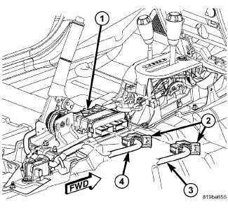 1. Carefully position the Occupant Restraint Controller (ORC) (2) onto the four studs of the ORC mount (3) on the floor panel transmission tunnel. When the ORC is correctly positioned, the bottom of the housing will fit flush with the mount and the orientation arrow on the label on top of the housing will be pointed forward in the vehicle.