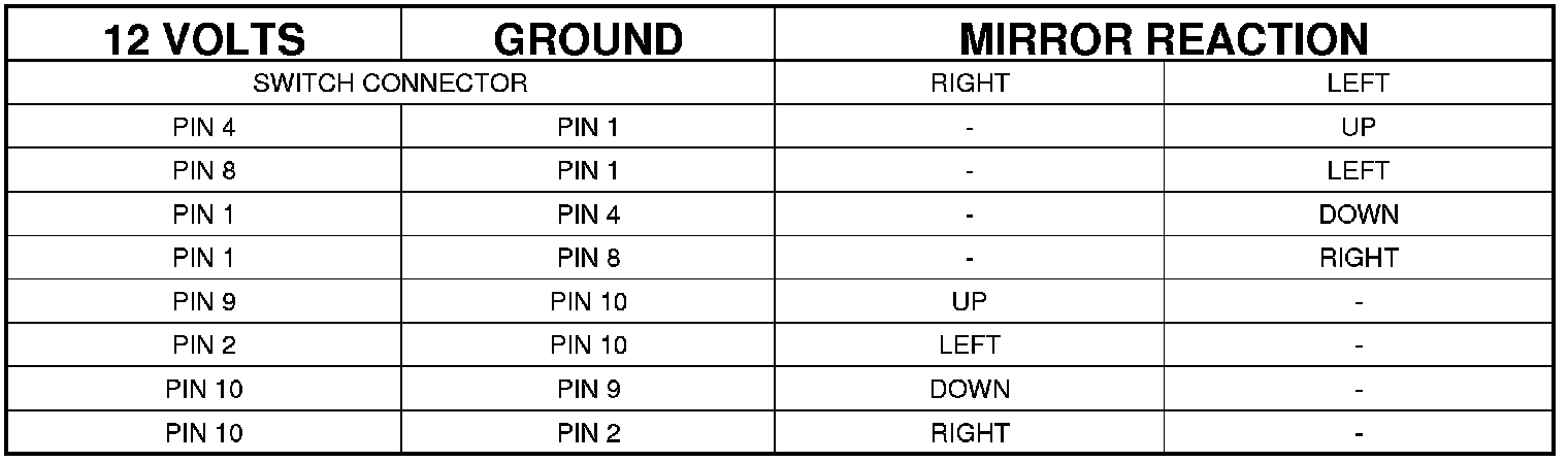 - Refer to the Mirror Motor Test Chart for proper wire connections at the switch connector.