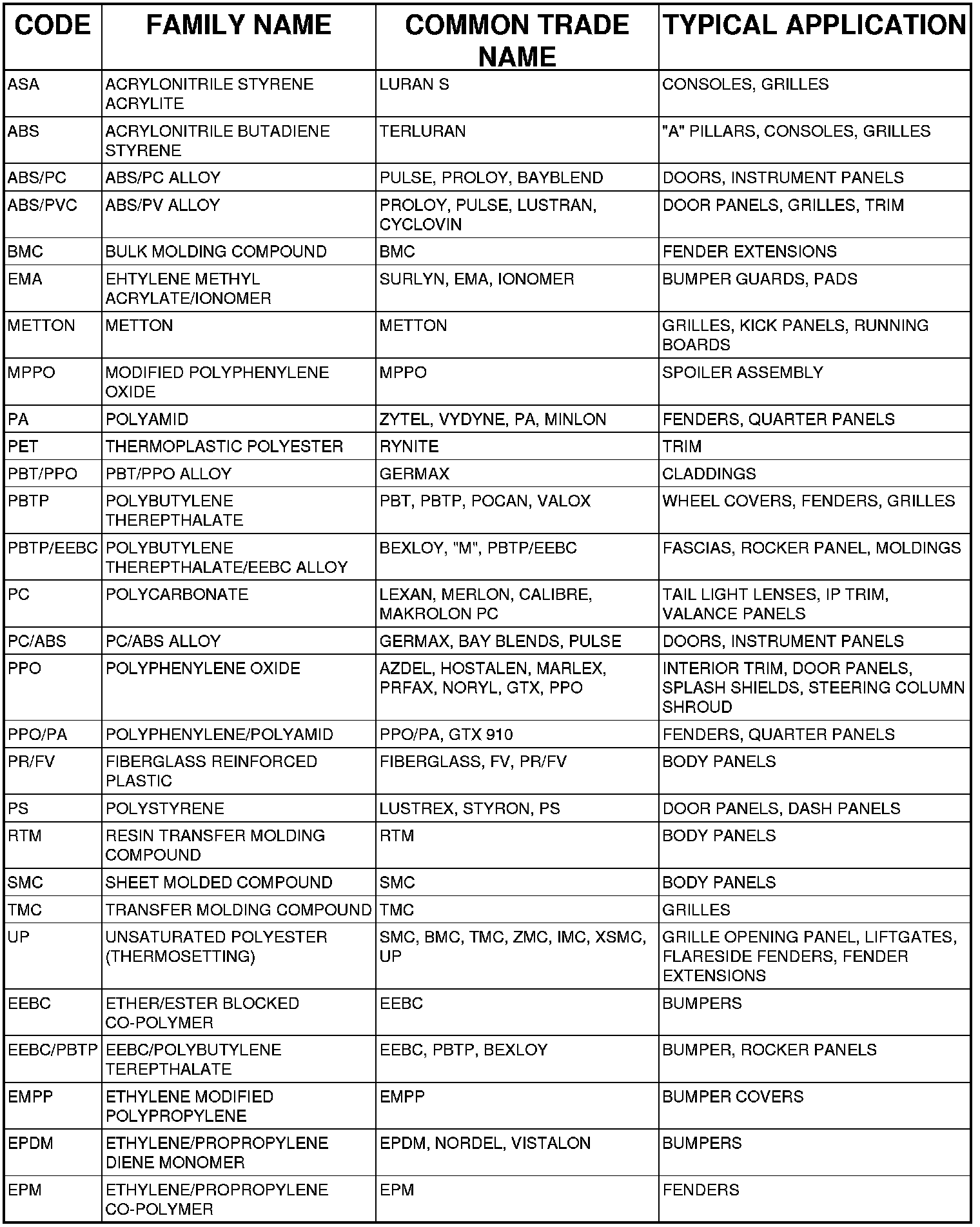 Examples of rigid plastic use: Fascias, Hoods, Doors, and other Body Panels, which include SMC, ABS, and Polycarbonates.