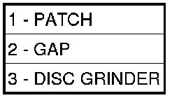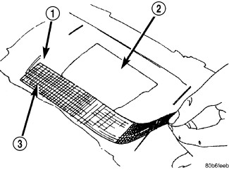17. Using a 125 mm (5 in.) 24 grit disc grinder (3), grind a 50 mm (2 in.) to 75 mm (3 in.) wide and 75% -80% deep (original material thickness) path across the gaps (2) around the patch (1). With compressed air, blow dust from around patch.