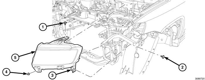 1. Position the front lamp unit (5) close enough to the front of the vehicle to reconnect the Front End Module (FEM) wire harness connections to the back of the lamp housing.