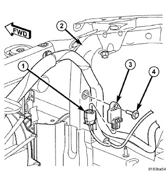 3. Carefully position the sensor onto the back of the right or left radiator support vertical member (2). Be certain that the anti-rotation pin on the back of the sensor is engaged in the clearance hole of the radiator support.