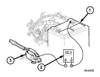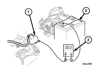 2. Connect volt-ampere tester leads (1 and 2 to the battery terminals. Connect volt-ampere tester lead (3) around the positive battery cable. See instructions provided by manufacturer of volt-ampere tester being used. Note: Certain diesel equipped models use dual batteries. If equipped with dual battery system, tester should be connected to battery on left side of vehicle only. Also, tester current reading must be taken from positive battery cable lead that connects to starter motor.