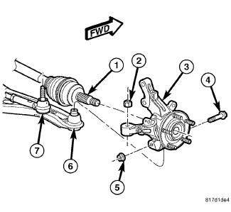 7. Install the ball joint (6) stud into the knuckle (3), aligning the bolt hole in the knuckle boss with the groove formed in the side of the ball joint stud.