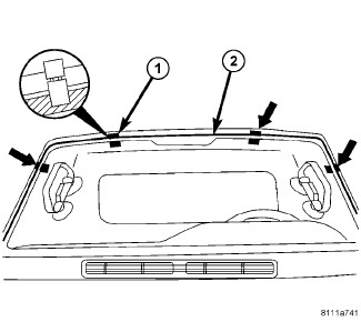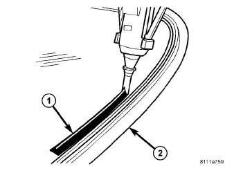 1. Apply bead of adhesive (1) with a triangular nozzle directly to the windshield seal starting at bottom in center of windshield.
