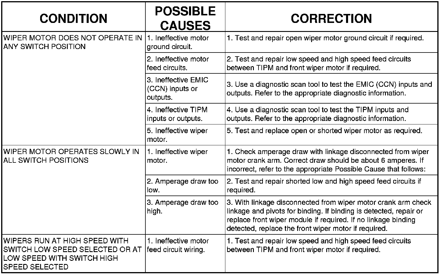 If the front wiper motor operates, but the wipers do not move on the windshield, replace the ineffective front wiper module. If the washer pump/motor operates, but no washer fluid is dispensed on the glass; or, if the wipers operate, but chatter, lift, or do not clear the glass, clean and inspect the front wiper and washer system components as required. Wipers And Washers - Cleaning and . Wipers And Washers - Inspection