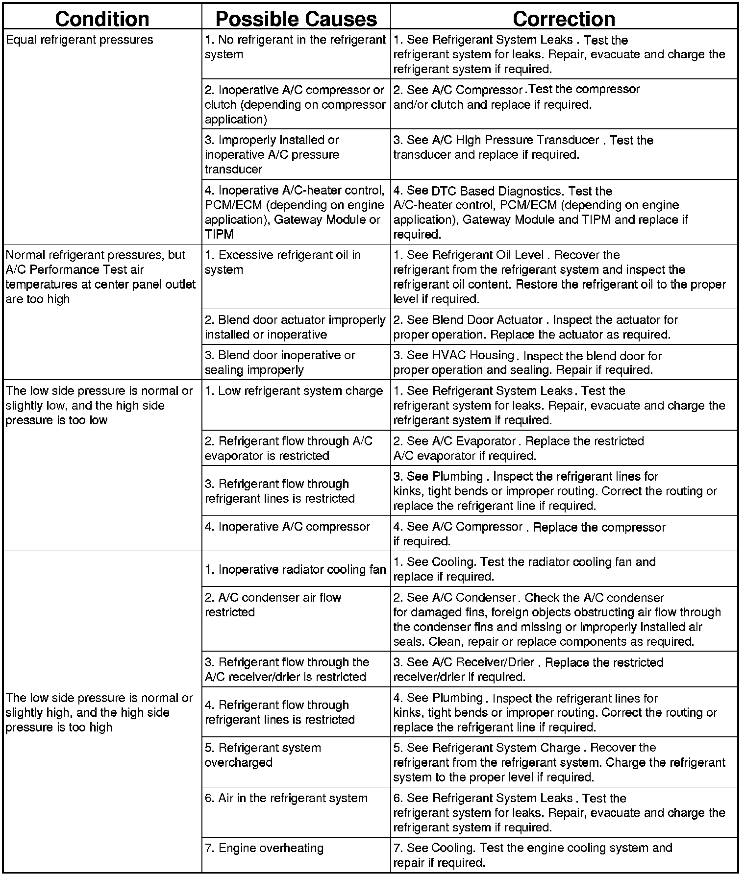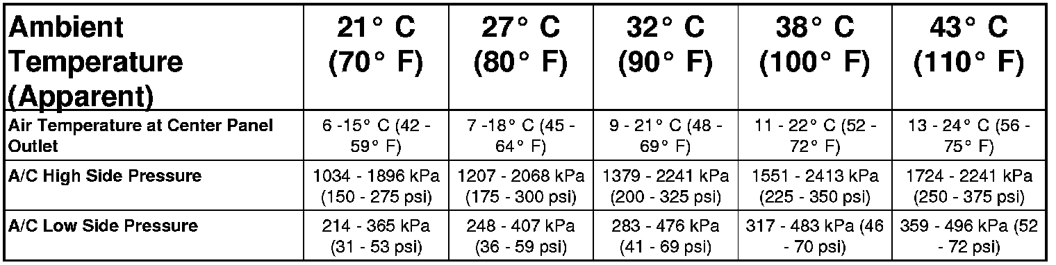5. Compare the air temperature at the center panel outlet and the A/C system pressures to the A/C Performance Temperature and Pressure chart.