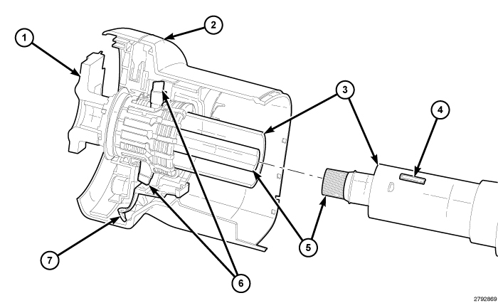 7. Confirm that the keystones are fully engaged in the column jacket slots by inspecting the round red indicator (7) visible on the lower surface of the SCCM shroud. The indicator should be flush with the shroud. If the indicator stands proud of the shroud, the keystones are NOT fully engaged. Carefully slide the SCCM slightly up and down, or rotate it slightly right and left as necessary for the keystones to snap into their slots and the indicator to become flush with the shroud.