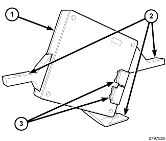 The PEM is secured by three screws to three tabs equipped with plastic nuts located on the outboard end of the air conditioning and heater unit blower housing beneath the passenger side end of the instrument panel. The PEM includes three integral mounting stanchions (2) and two connector receptacles (3) integral to the PEM housing. The connector receptacles contain all of the terminal pins that connect the PEM to the vehicle electrical system through two dedicated take outs and connectors of the instrument panel wire harness.