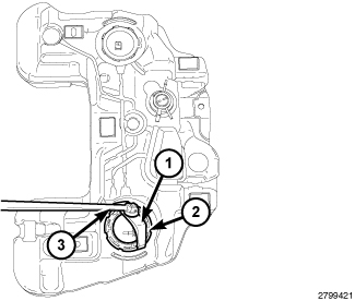 5. Position the SAE Fuel Pump Lock Ring Wrench (1) into the notches on the outside edge of the main fuel pump module lock ring (2).