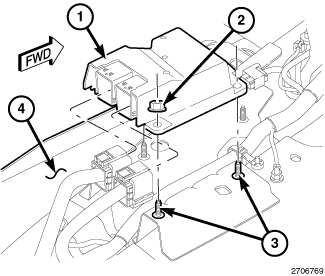 4. Remove the three nuts (2) that secure the ORC to the three weld studs (3) on the ORC bracket welded onto the top of the floor panel transmission tunnel.