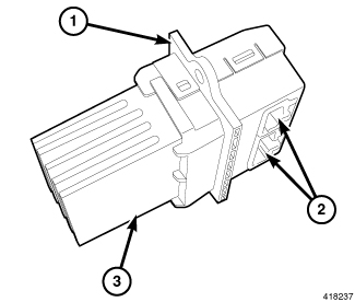 The blower motor power module is mounted to the rear of the HVAC housing, directly behind the glove box. The blower motor power module consists of a molded plastic housing with an integral mounting plate (1) and two connector receptacles (2). Concealed within the housing is the power module electronic circuitry. Behind the mounting plate is a finned aluminum heat sink (3).