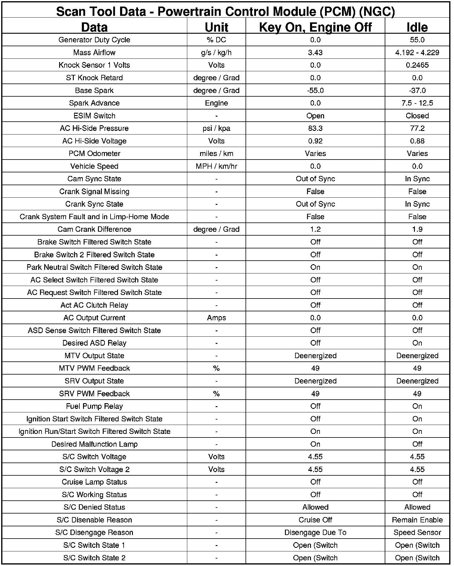 The following chart lists data values taken from the Scan Tool Powertrain Control Module (PCM) data list for the NGC controller. The values were taken at key on, engine off and at idle. The data is to be used for reference only.