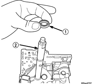 1. Install the TRS (2) to the manual shaft. Make sure TRS locating pin rests in manual valve bore slot.
