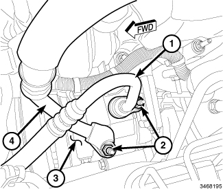 8. Connect the A/C discharge line (1) and the A/C suction line (4) to the A/C compressor (3).