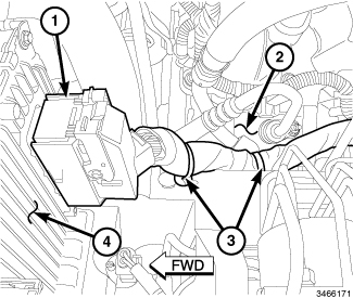 10. Connect the wire harness connector (1) to the Powertrain Control Module (PCM) (4) and engage the connector lock.