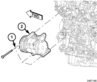 NOTE: The two rear retaining bolts must be installed onto the A/C compressor prior to positioning the compressor onto the engine.