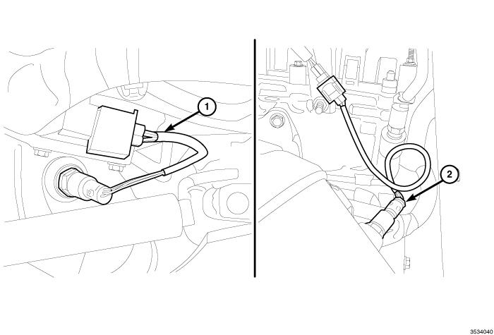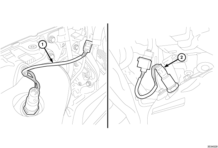 2. Install the right upstream 1/1 oxygen sensor (1) or the right downstream 1/2 oxygen sensor (2) and tighten to 50 Nm (37 ft. lbs.).