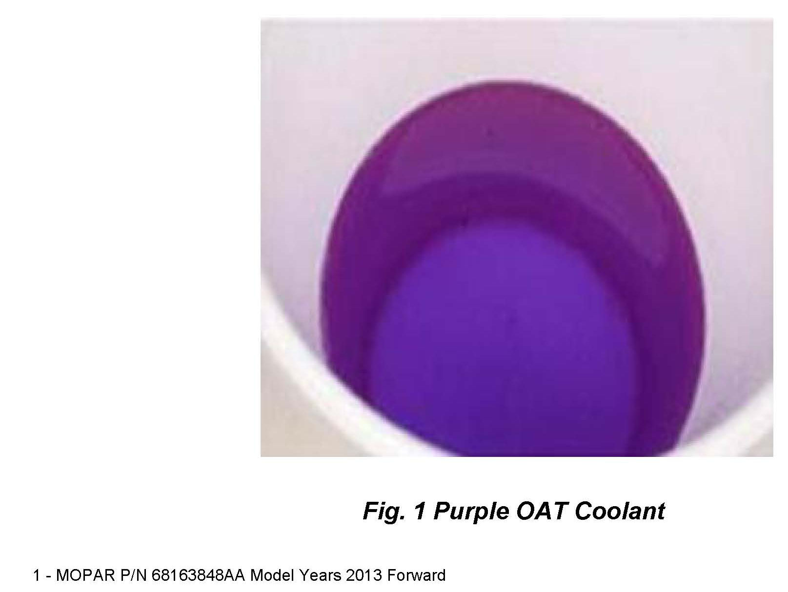 Chrysler Corporation LLC. has released a new engine coolant for the 2013 model year vehicles and beyond, for all engine applications except the ones listed in the note above. This new coolant is an Organic Additive Technology (OAT) (Fig. 1). OAT coolants have a service interval of 10 years or 150,000 miles. For heavy duty truck and extreme duty cycle