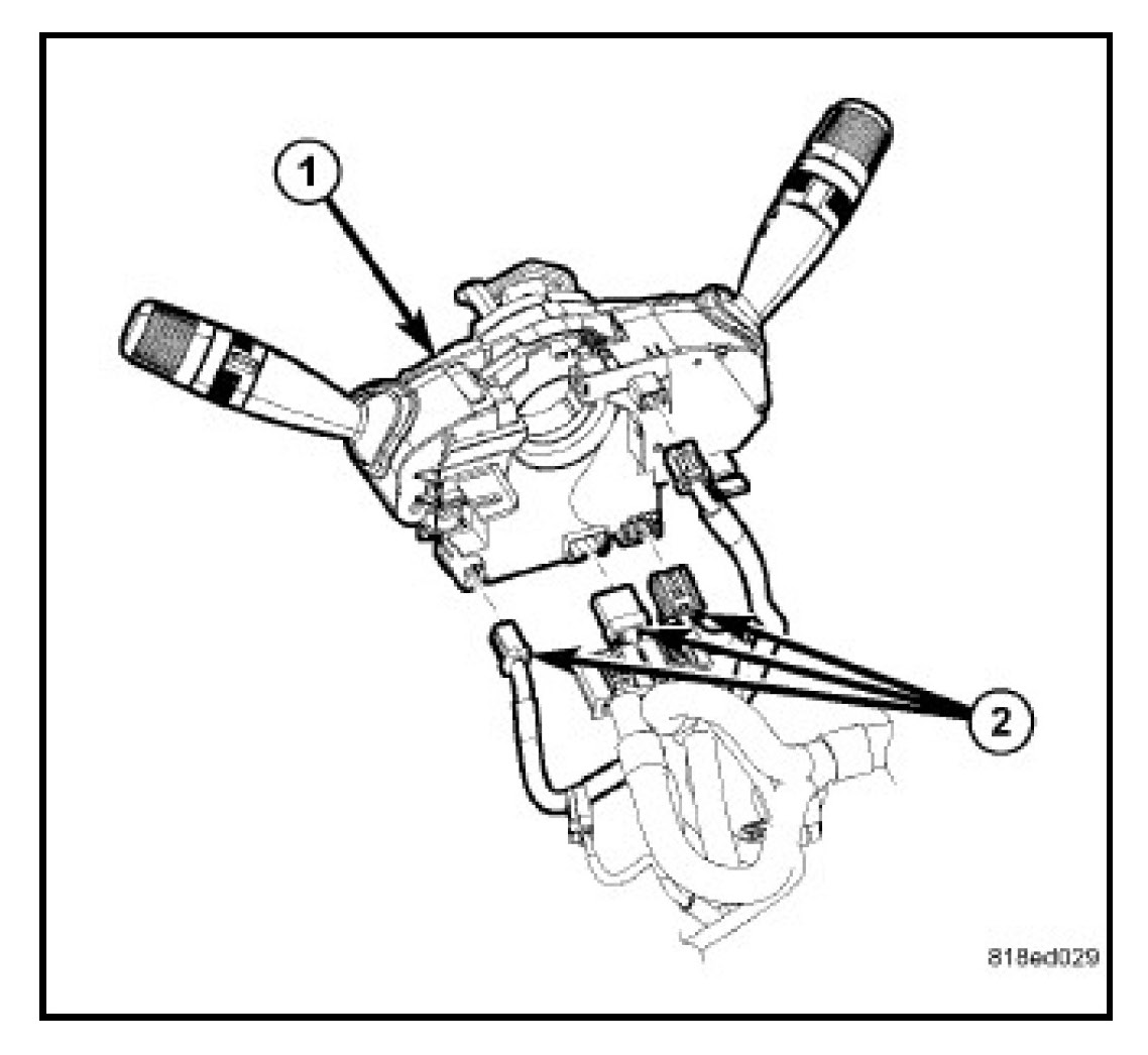 10. Pull the clockspring (1) away from the steering column lock housing far enough to access and disconnect the three instrument panel wire harness connectors (2) from the receptacles on the back of the clockspring case.