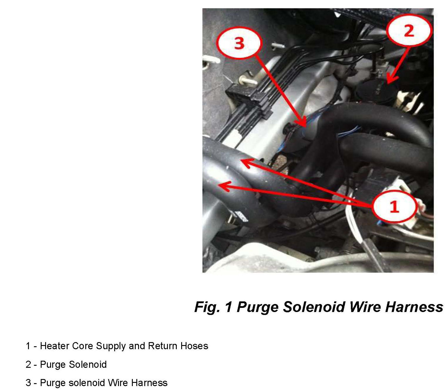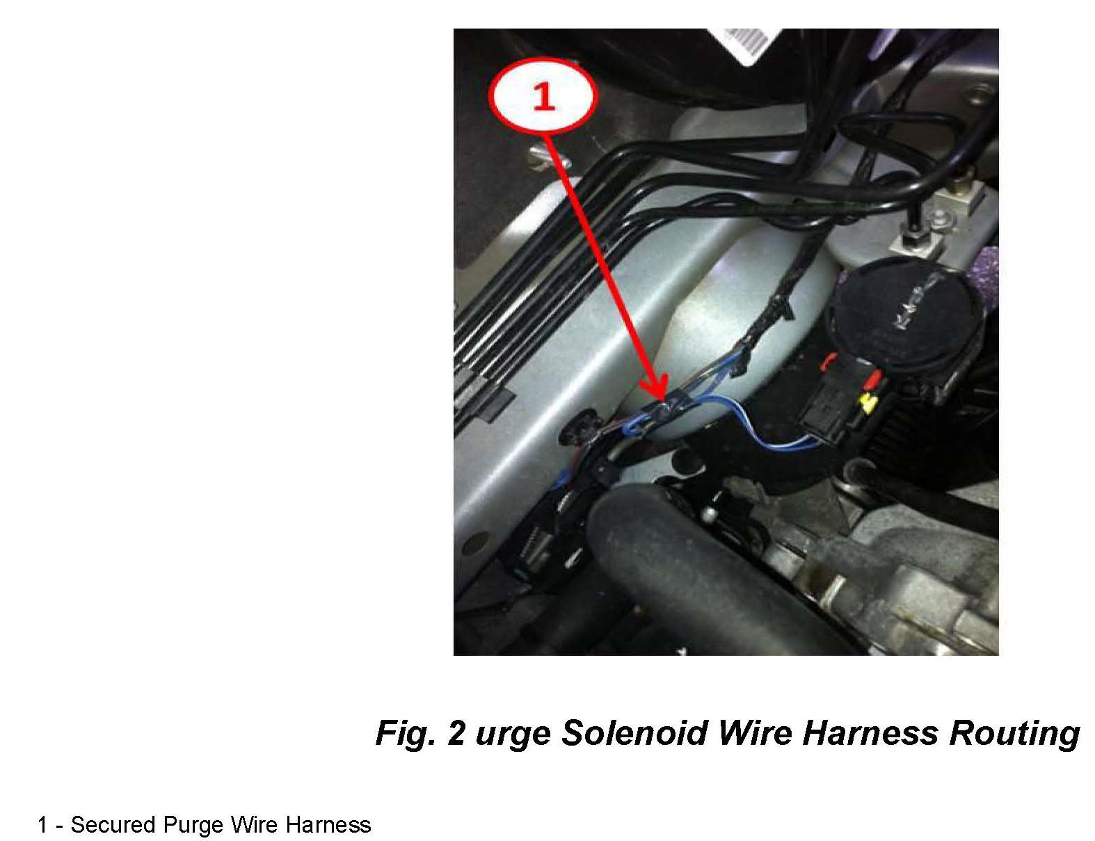 12. To ensure that the purge solenoid wiring harness (Fig. 1) does not come in contact with the heater hoses, the wire harness will require a slight modification.