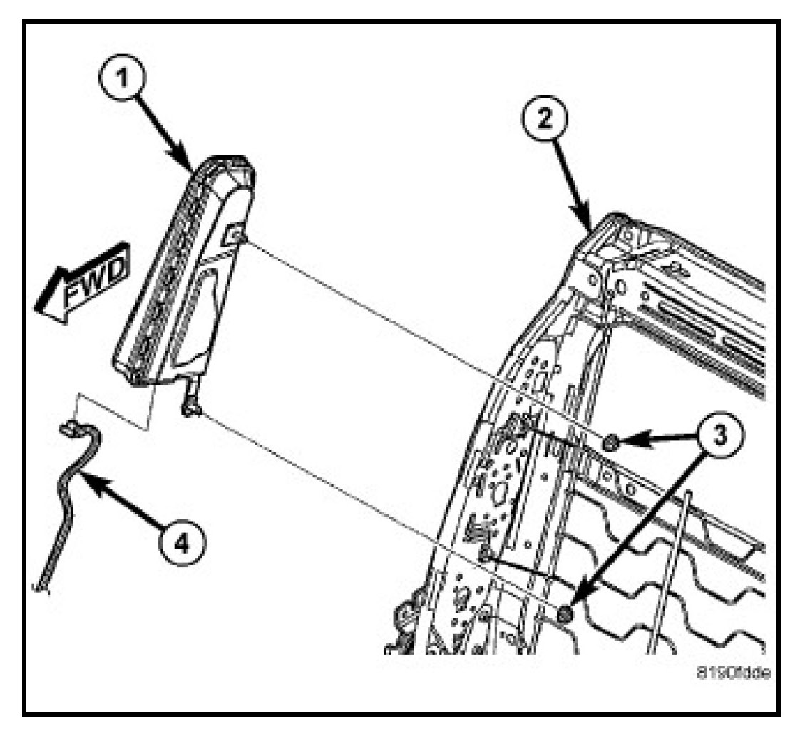 3. Install and tighten the two nuts (3) that secure the seat airbag to the side of the seat back frame. Tighten the nuts to 10 N.m (89 in. lbs.).