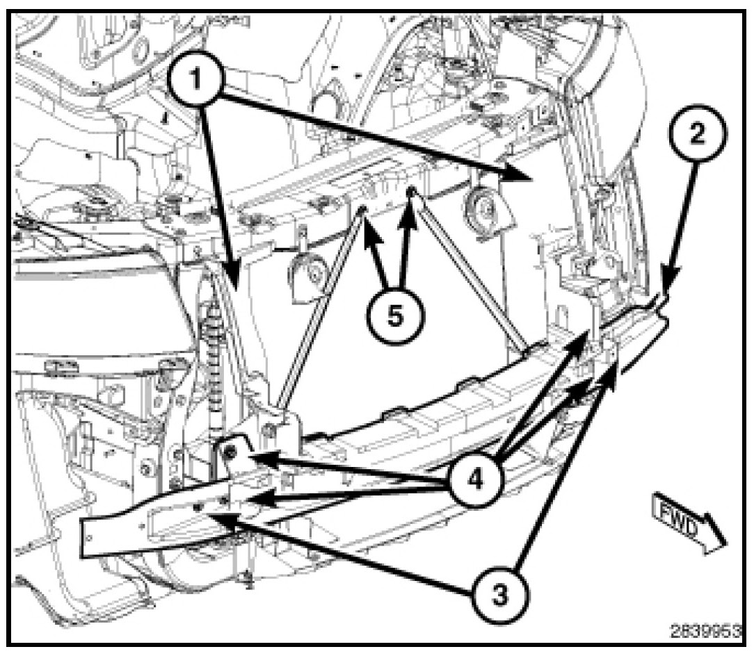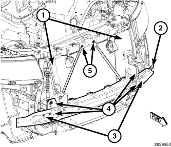 3. Remove the fasteners (5) that secure the hood latch assembly and the upper radiator support cross bracing.