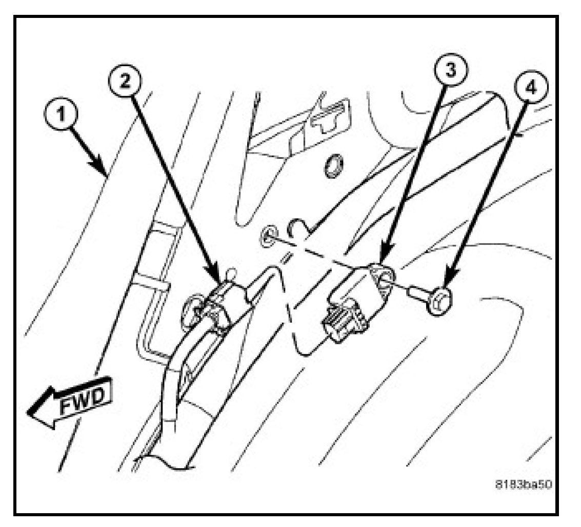 3. Install and tighten the screw (4) that secures the sensor to the inner C-pillar. Tighten the screw to 8 N.m (70 in. lbs.).
