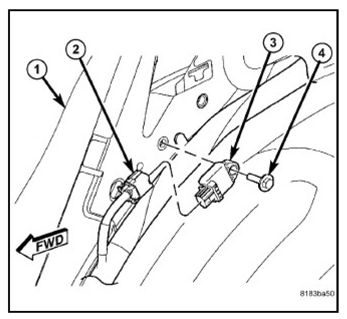 3. Remove the screw (4) that secures the side impact sensor (3) to the C-pillar.