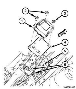 1. Carefully position the Occupant Restraint Controller (ORC) bracket (4) and the ORC (1) onto the weld stud (5) at the right front corner of the ORC mount on the floor panel transmission tunnel. When the ORC is correctly positioned, the orientation arrow on the ORC label will be pointed forward in the vehicle.
