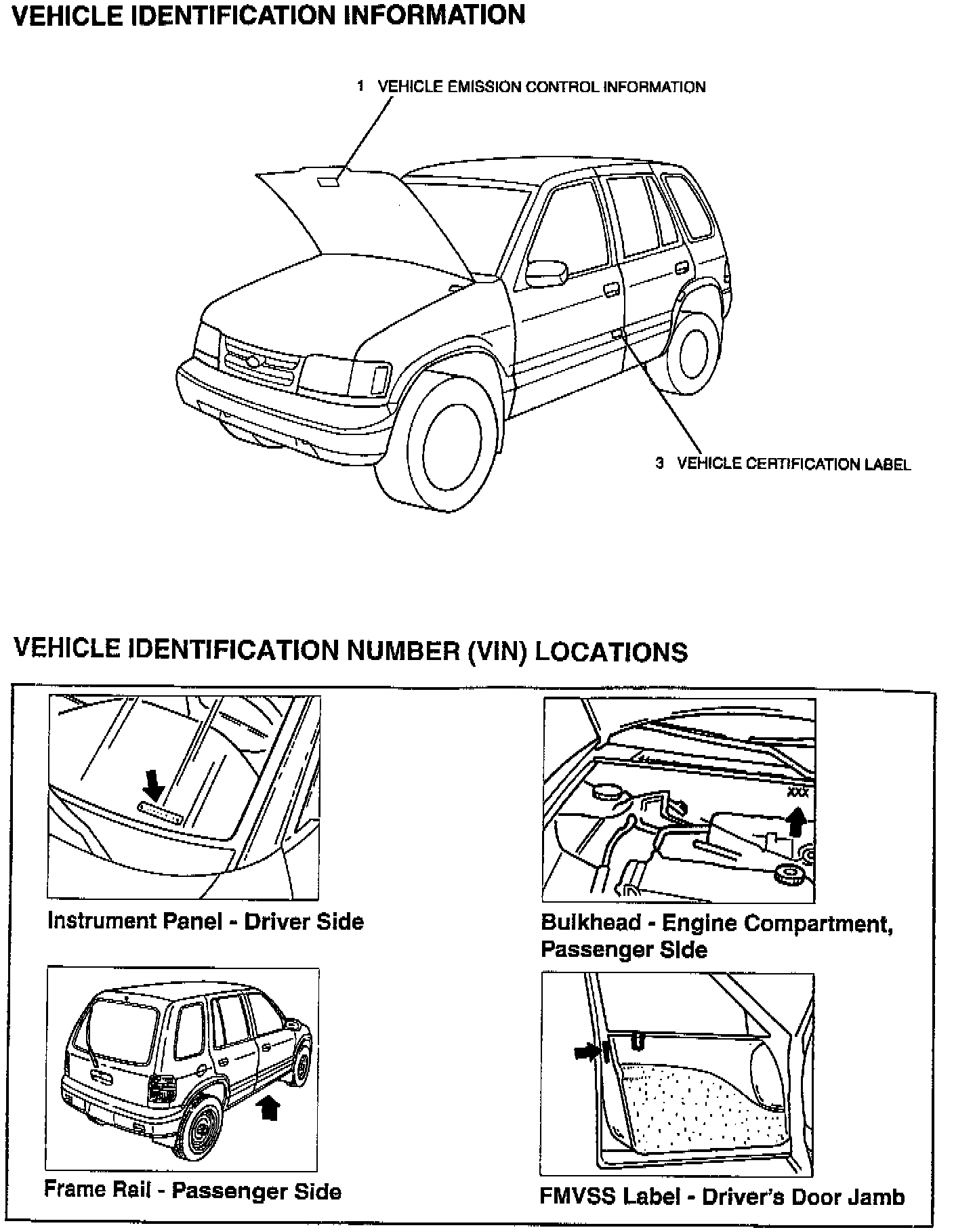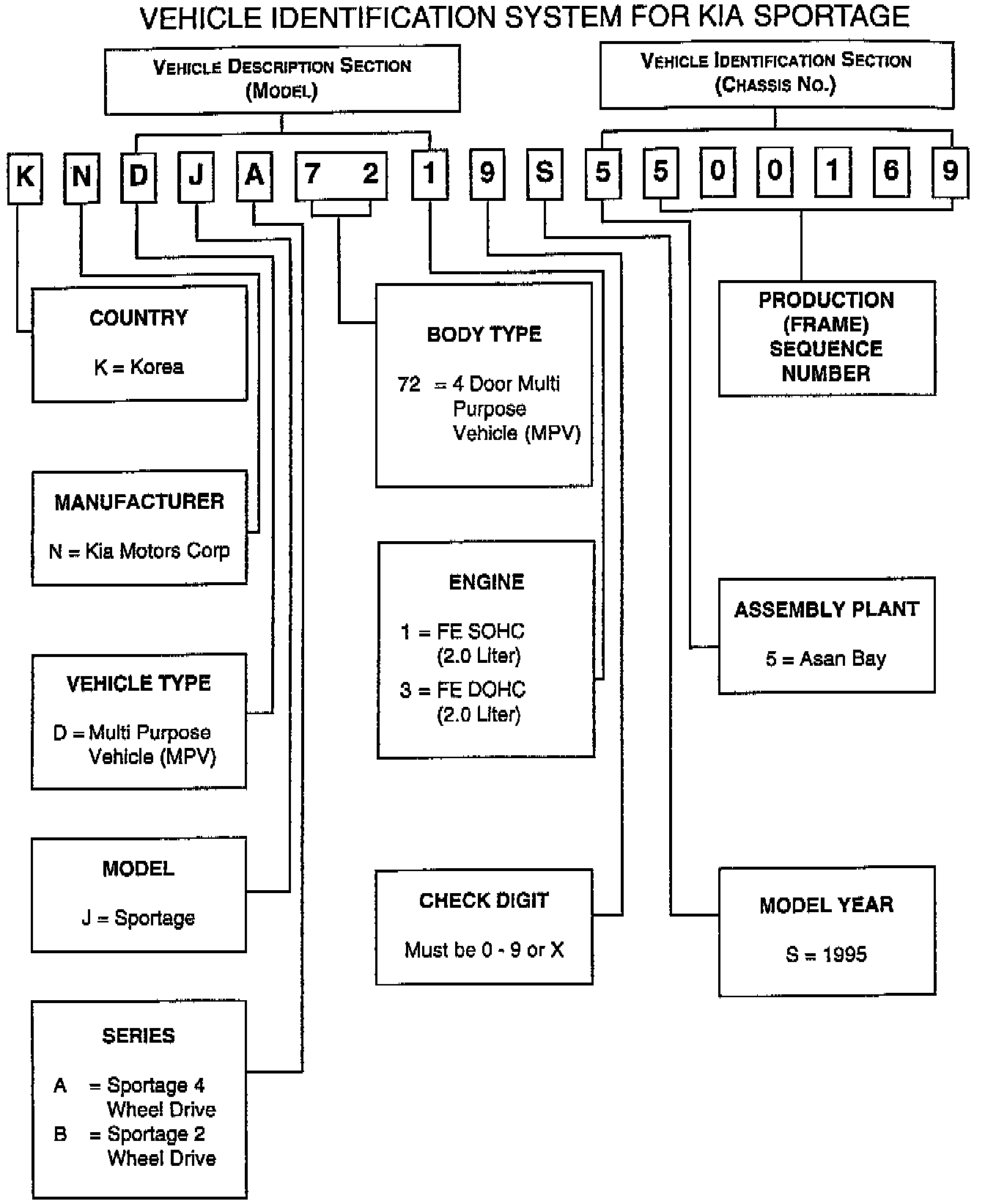 The Vehicle Identification Number for the Kia Sportage is comprised of seventeen (17) digits and is stamped on a metal plate that is located on the drivers side of the instrument panel visible from outside of the vehicle through the windshield. The VIN is also stamped into the center of the engine compartment bulkhead, into the passenger side of the frame (forward section) and it is printed on the Federal Motor Vehicles Safety Standards (FMVSS) label which is attached to the driver's door jamb.