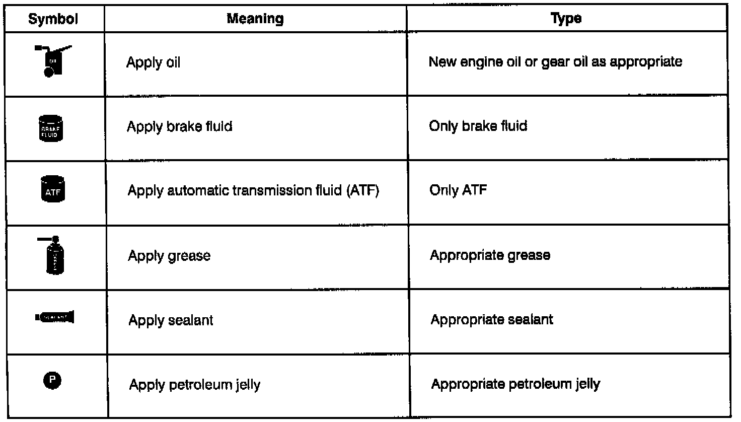 There are six primary symbols used to complement illustrations. These symbols indicate the areas to apply such materials during service.