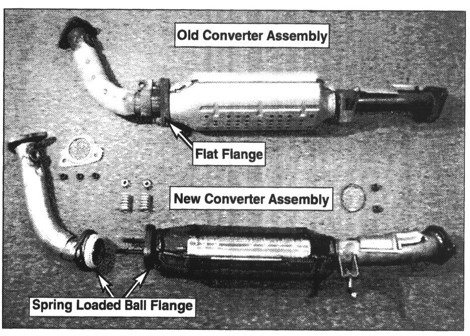 The replacement catalytic converter assembly and related parts differ somewhat from the original parts. The illustration shows the old and new converter assemblies. The new converter assembly comes in a kit which includes the front pipe, gaskets and hardware shown in the illustration.