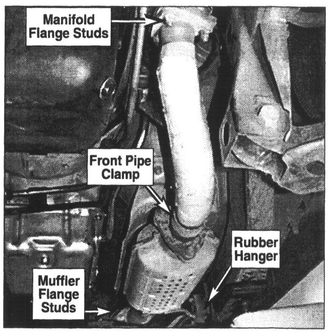 2. Spray penetrating oil on front pipe to manifold flange studs and on rear catalytic converter flange to muffler studs to facilitate removal.