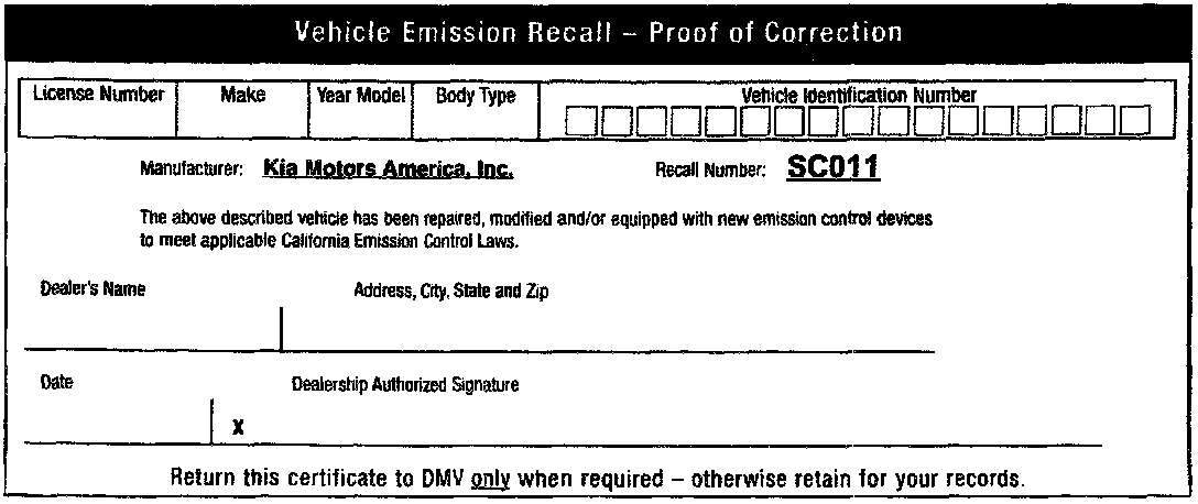 For vehicles sold in California, a supplied Vehicle Emission Recall Proof of Correction Form must be completed and given to each owner upon completion of the recall service for owner use as proof during renewal of vehicle registration.