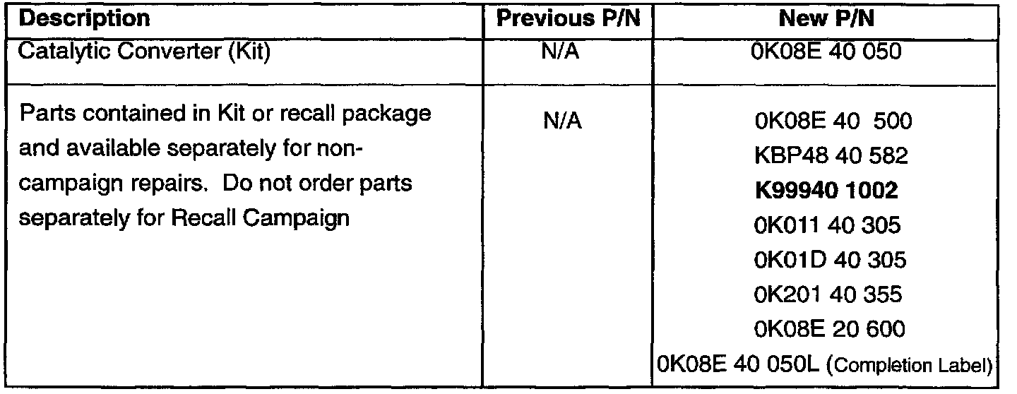 ^ There is no charge to the customer for this repair. Under applicable law you may not sell or otherwise deliver any affected 1995 Sportage until the catalytic converter has been replaced.