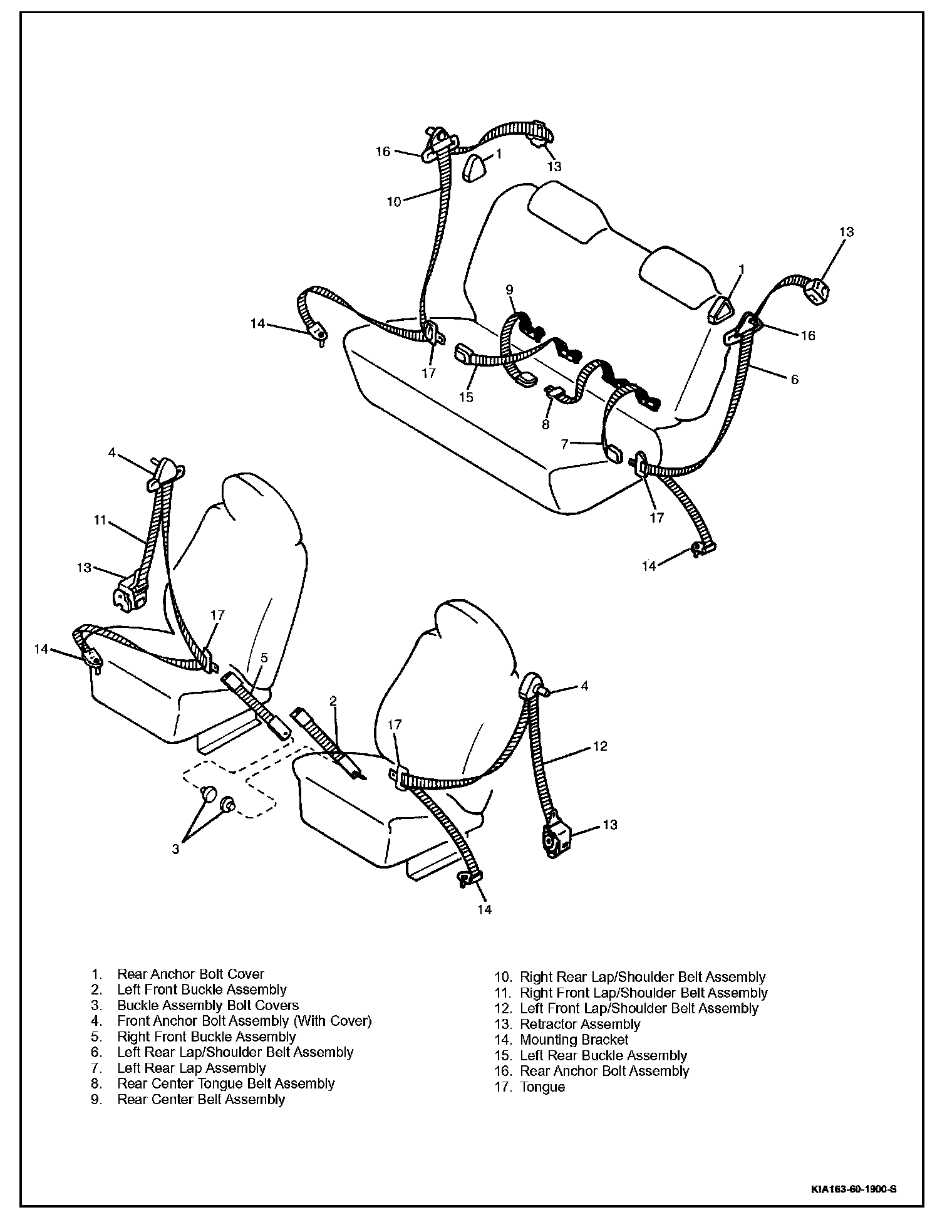 The seat belt system consists of five restraints. The outboard passengers (front and rear) have both shoulder and lap seat belts. The inboard passenger (rear) has only a lap seat belt. The driver's seat belt is equipped with a warning lamp on the dash and an audible chime to remind the driver to fasten the seat belt. The warning ceases after approximately 60 seconds. There are no warnings on the other passengers' belts. The retractors are securely mounted to the body. The buckles are also securely mounted to the floor.