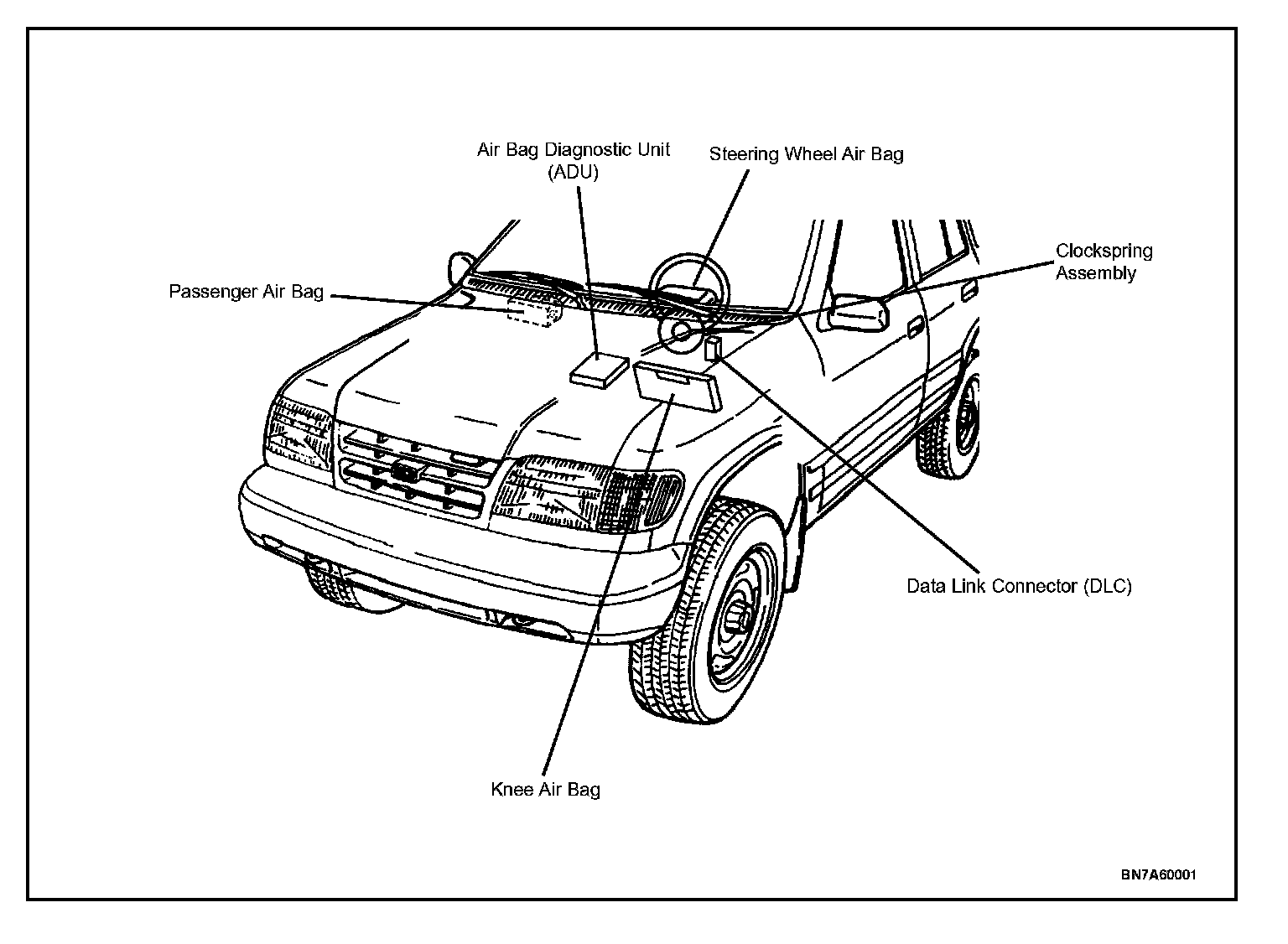 The Air Bag-Supplemental Restraint System (SRS) is designed to supplement driver and passenger seat belts during front-end collisions, reducing the risk of serious injury or death. Two collision-sensitive sensors are located in the Air Bag Diagnostic Unit (ADU). When a frontal collision of sufficient force occurs, the senses it causing ignition in each of the air bags. The driver is protected by a Steering Wheel mounted Air Bag, and, a Knee Air Bag, located behind the driver's knee bolster, and also, the passenger is protected by a passenger air bag, located on instrument panel.