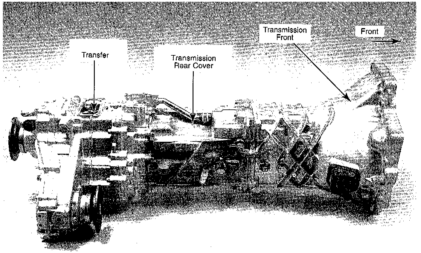 The clutch release lever and the crankshaft position sensor are located in the front housing. The back-up light switch is located in the rear cover on both 4X2 and 4X4 models. The rear cover on 4X2 models has an extension housing bolted to it, and the 4X4 rear cover has the transfer case bolted to it. The vehicle speed sensor is mounted on the extension housing on 4X2 models, and on the rear cover of the transfer case on 4X4 models.