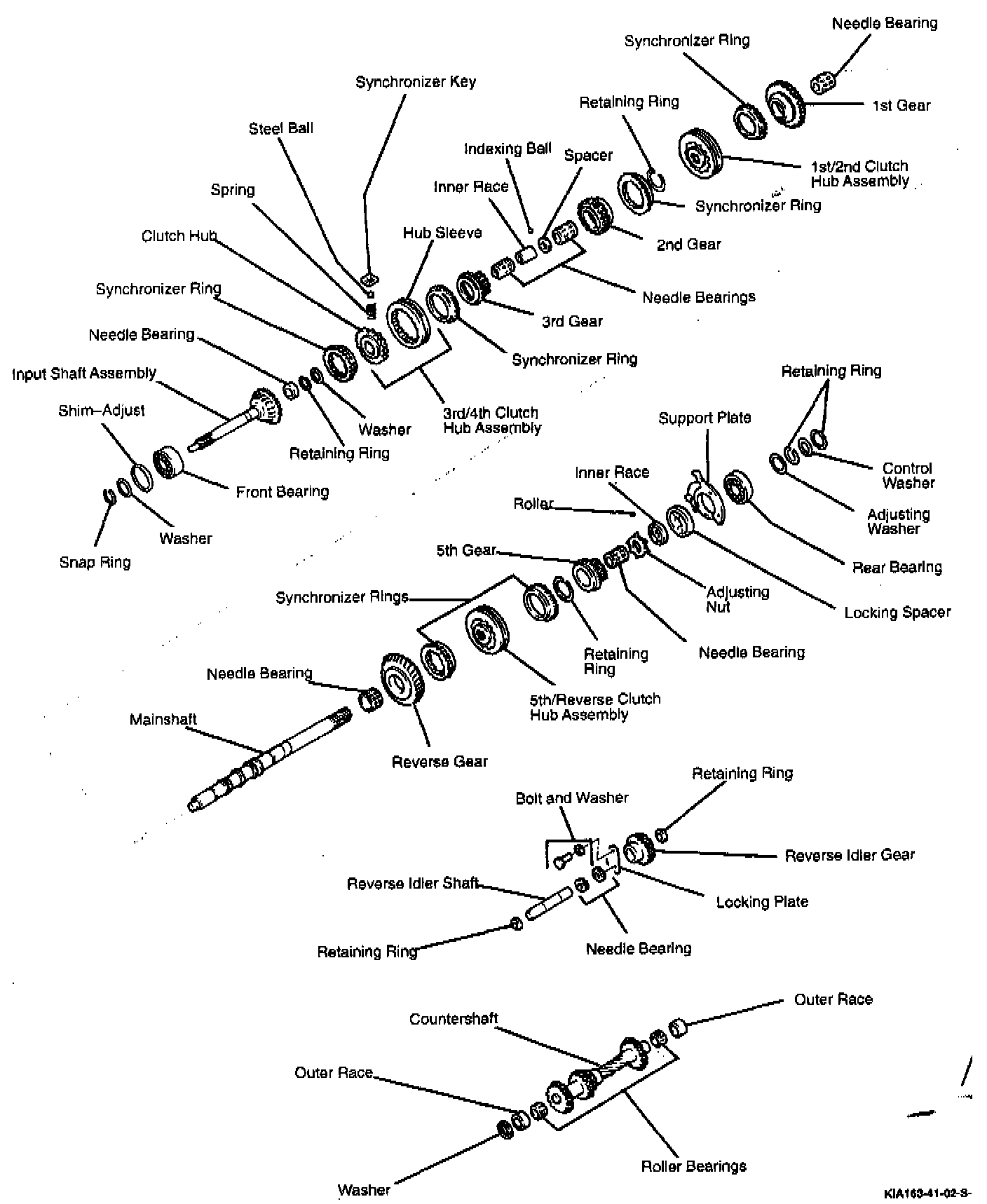 The Getrag-designed manual transmission, installed in both the 4X2 and 4X4 Sportage models, has five forward speeds and reverse. The transmission is fully synchronized in all gears, including reverse. There are four separate gear carrying shafts: the input shaft, mainshaft, countershaft, and reverse idler shaft. The forward end of the mainshaft is supported in a needle bearing that is installed in the rear end of the input shaft. When fourth gear is selected, a clutch hub mechanically links the input shaft directly to the mainshaft. There are no meshed gears in the power flow path when fourth is selected, and the resulting drive ratio is 1:1. This results in five pairs of meshed gears: first, second, third, fifth and reverse. All five pairs are helically cut, and each pair is in constant mesh.