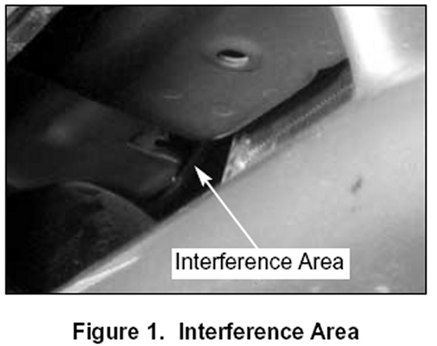 The noise created by the interference between the body sheet metal and the radiator mount can occur on both sides of the vehicle. Previous information only identified the right side of the vehicle, however the interference can occur on either side. Figure 1 shows the interference area from under the vehicle.