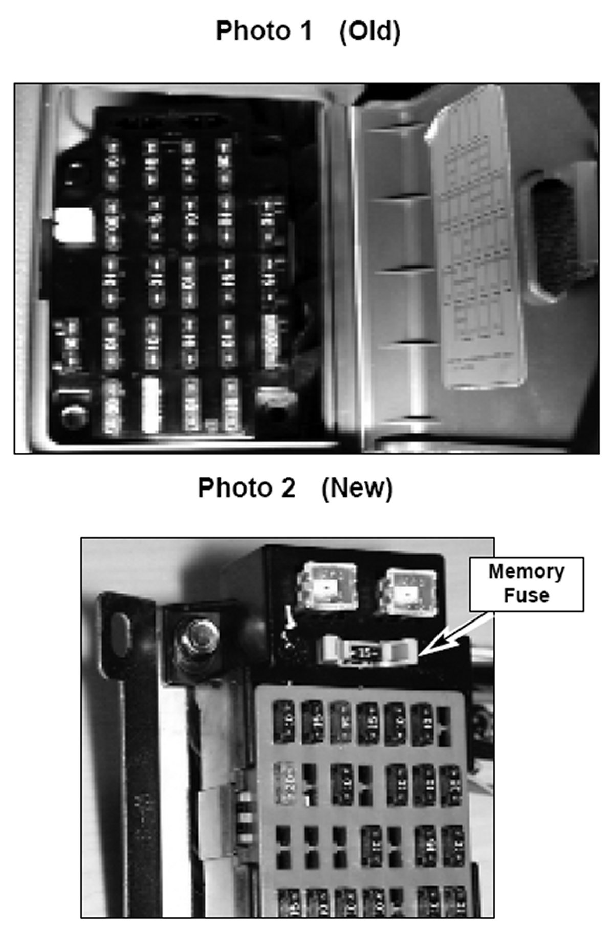 From 2/19/99 vehicle production, the Sportage passenger compartment fuse box (photo 1) has been changed. The new fuse box (photo 2) now incorporates a switchable memory fuse. Previously, the room fuse was removed during shipping, and reinstalled during PDI; with the new fuse box, the memory fuse is switched off by pulling the fuse holder up; it can be switched back on by pushing the fuse holder all the way in. Additional changes: the previously used standard fuses were changed to the "mini" style fuses, and the power window and heater fuses are the "slow blow" type.