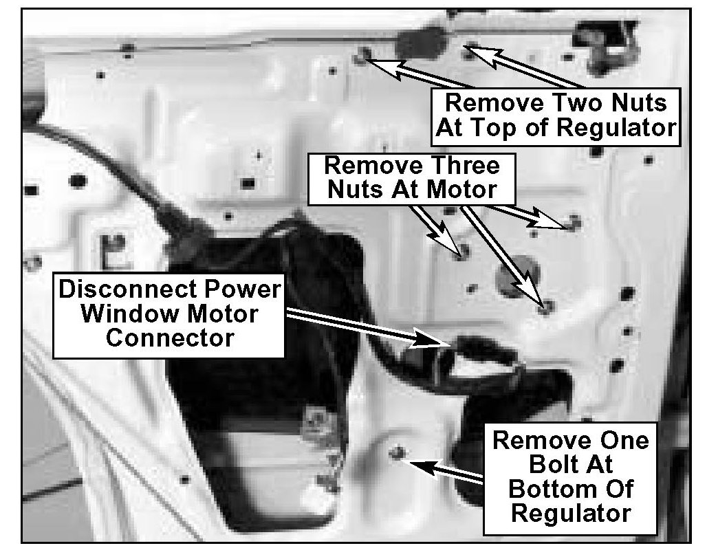 11. Remove three nuts at motor, two nuts at top of regulator and one bolt at bottom of regulator.