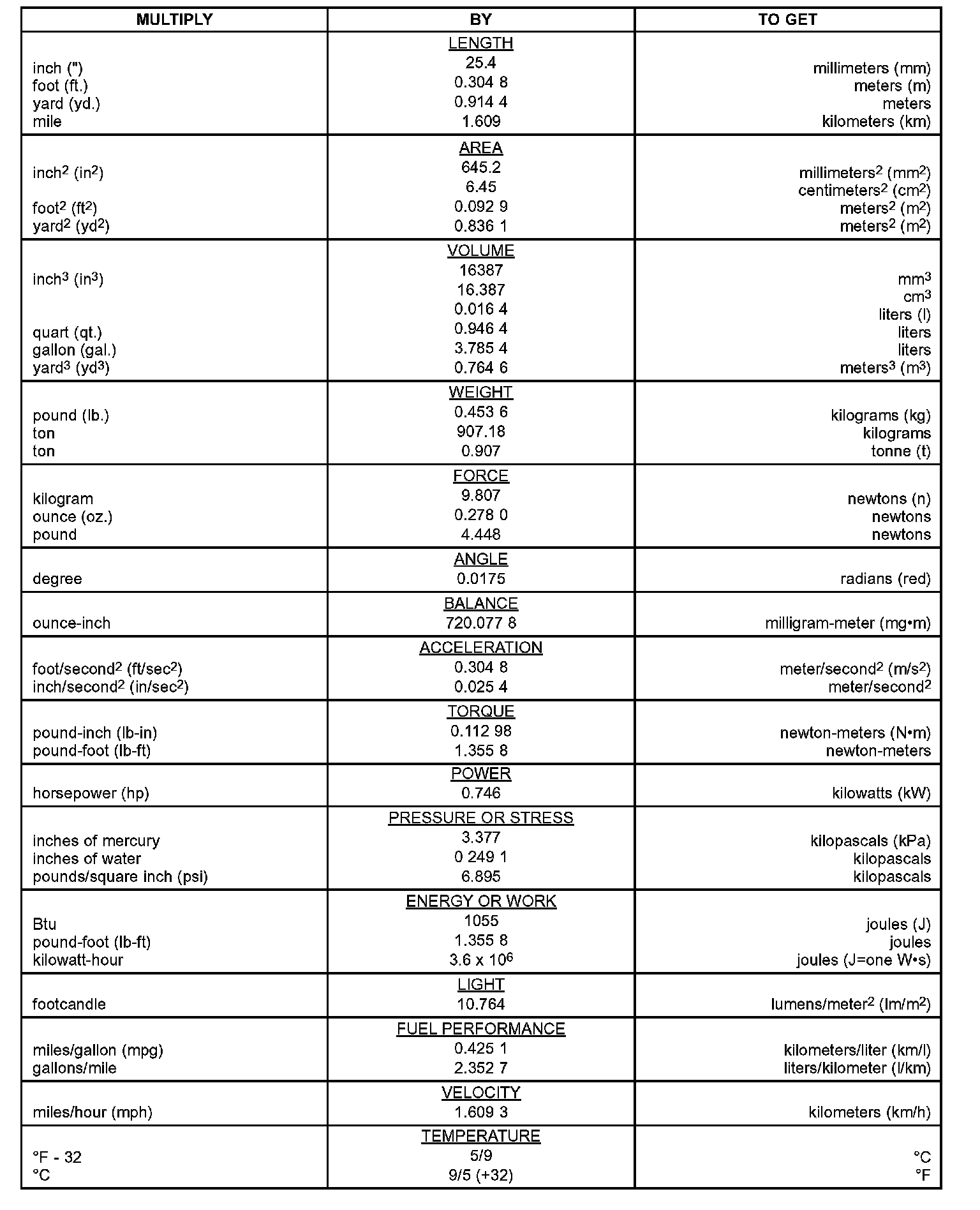 Unit Conversion Table:
