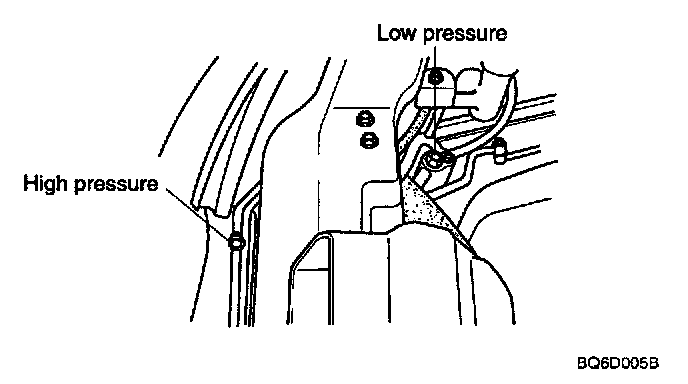 Connect a R-134a refrigerant Recovery/Recycling/Charging System to the high-pressure service port and the low-pressure service port, as shown, following the equipment manufacturer's instructions.