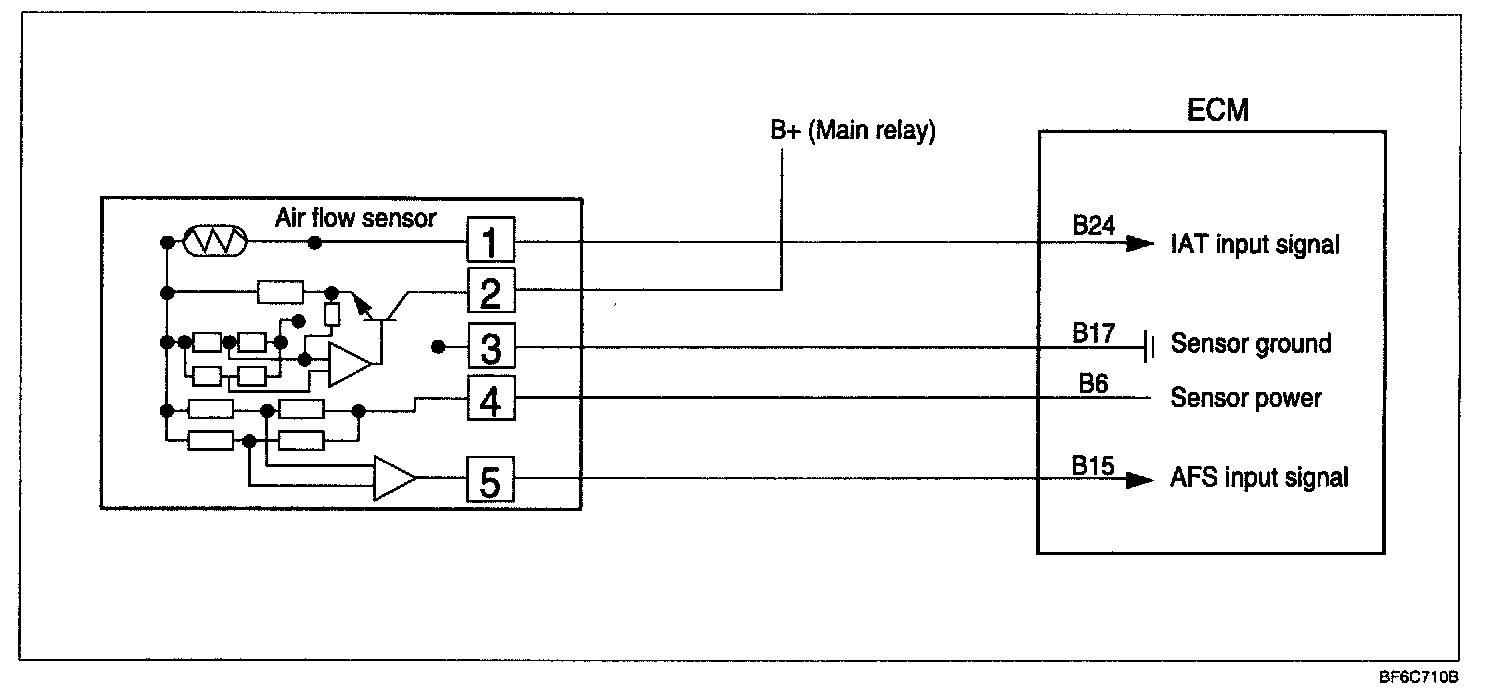 The air flow sensor adopts the feature of maintaining a certain temperature of the heater for sensor to make the hot film element detect the air flow and send related signal to the ECM. The ECM then determines the fuel amount and ignition timing and check the information to apply the fuel and A/C load correction.