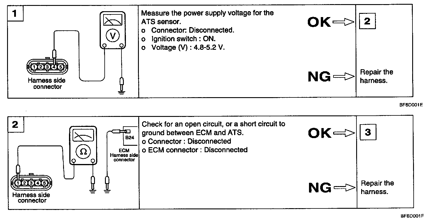 2. If the MAFS sensor output voltage is other than 0 when the ignition switch is turned ON (do not start the engine), check for faulty MAFS and ECM.