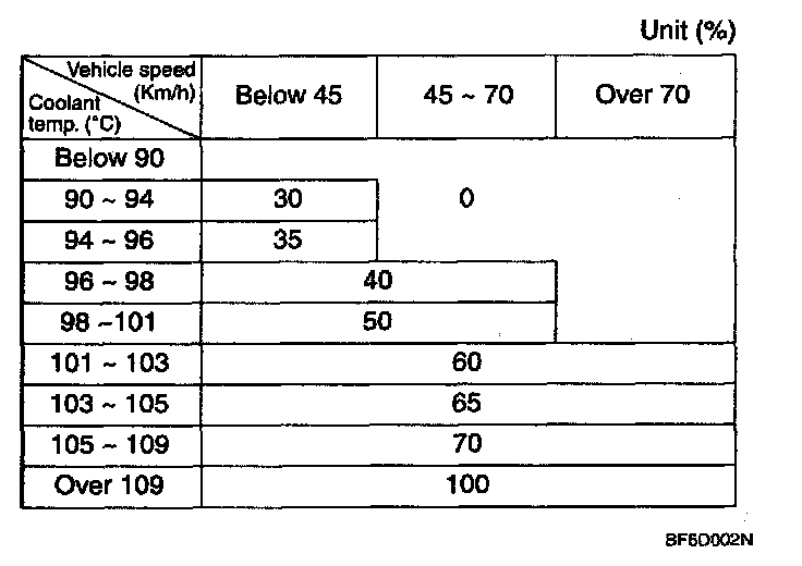 COOLING FAN CONTROLLEREngine ECM controls the rate of cooling fan with engine coolant temperature and vehicle speed. The cooling fan controller receives signal from the ECM to control the rate of cooling fan.