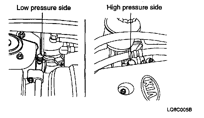 Connect a R-134a refrigerant Recovery/Recycling/Charging System to the high-pressure service port and the low- pressure service port, as shown, following the equipment manufacturer's instructions.