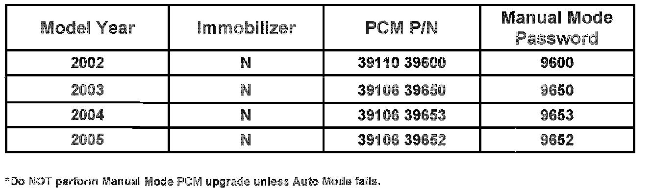 Do NOT attempt to perform a Manual Mode PCM upgrade unless Auto Mode fails. Always follow the instructions given on the GDS tool in either Auto or Manual Mode. See table above for Manual Mode passwords.